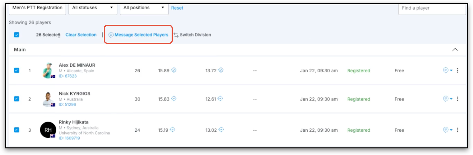 You can access this view by opening the Players tab on your event profile, where all registered players across every division are displayed in a single, organized list.